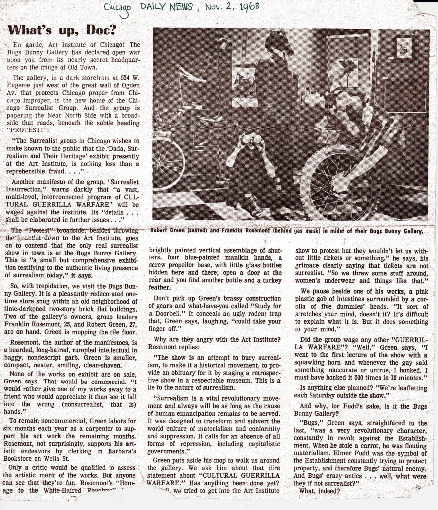 The image above is of the first exhibition at the Gallery Bugs Bunny in Chicago. The Gallery was founded by Robert Green in 1968 in protest to an exhibition at the Art Institute of Chicago called “Dada, Surrealism and Their Heritage”. The Gallery Bugs Bunny exhibition  included six artists including Green, Franklin and Penelope Rosemont, Lester Dore, Eric Matheson and Schlechter Duval and was favorably reviewed , not only in college papers, but also in the Chicago Daily News, Sun Times, and Tribune.
